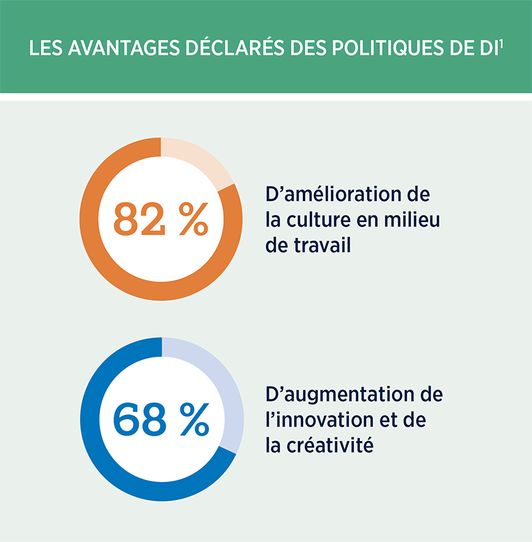 Plus de quatre personnes répondantes sur cinq qui travaillent dans les RH ont mentionné une amélioration de la culture en milieu de travail grâce aux politiques de DI et plus des deux tiers ont constaté que la DI favorisait l'innovation et la créativité1. Les organisations inclusives sont également 73 % plus susceptibles de récolter des revenus de leur innovation, 70 % plus susceptibles de conquérir de nouveaux marchés et jusqu'à 36 % plus susceptibles d'être plus rentables que la moyenne2.