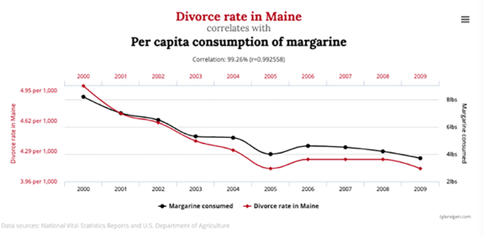For example, does eating margarine cause divorce? It’s highly likely that most of us would give that a hard ‘NO!’. However, if you live in Maine, USA, the stats say…