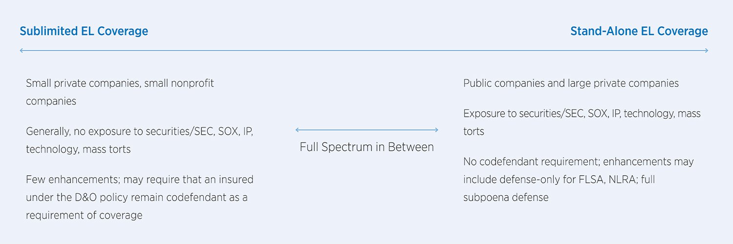 The more limited variety of EL coverage costs either a minimal premium or no additional premium when added to a D&O policy. But this form of EL coverage also offers no additional limit-it merely sets aside a sublimit to cover employed lawyers. Insurers typically add sublimited EL coverage as an enhancement on smaller, less complicated accounts.
