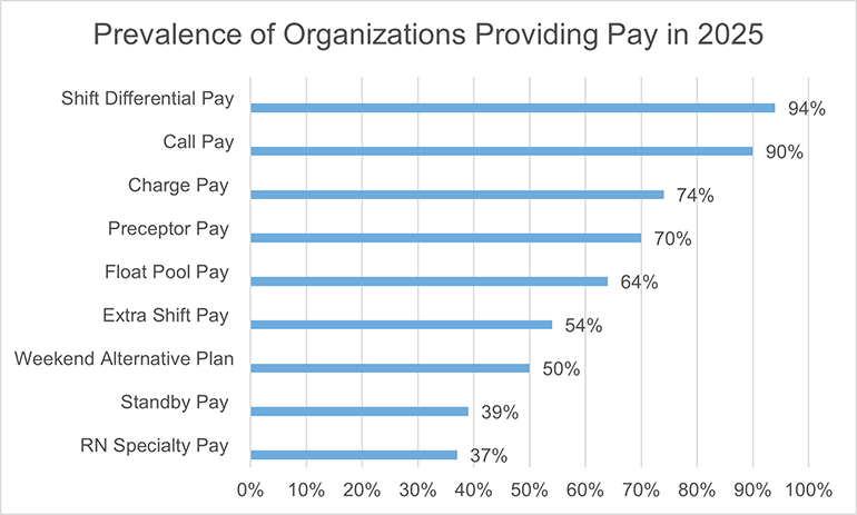 Additional pay for registered nurses (RNs) in such specialty areas as the emergency department (ED), operating room (OR) and critical care has fluctuated since 2020, declining slightly in 2025. Among organizations offering RN specialty pay, 42% use higher pay grades, 45% use flat-dollar differentials, and 18% use percentage differentials — a declining practice. Specialty pay occurs most commonly in OR (60%), cardiovascular ED (51%) and ED (44%).