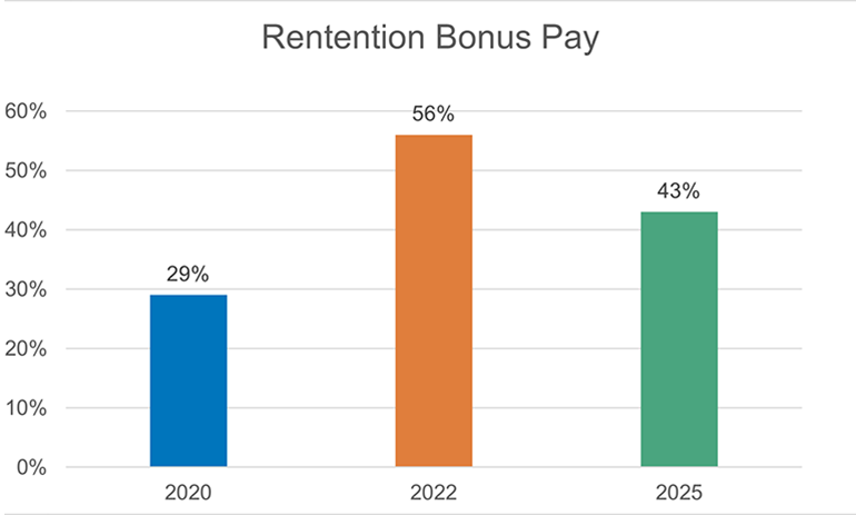 Hiring and retention bonuses gained traction during the pandemic. While hiring bonuses remain popular, use of retention bonuses has declined from 56% in 2022 to 43% in 2025. Other financial incentives include performance, tenure, certification bonuses, group incentives and gainsharing plans. These plans allow staff to share financial savings achieved through improved efficiency, quality or cost reduction without compromising patient care.