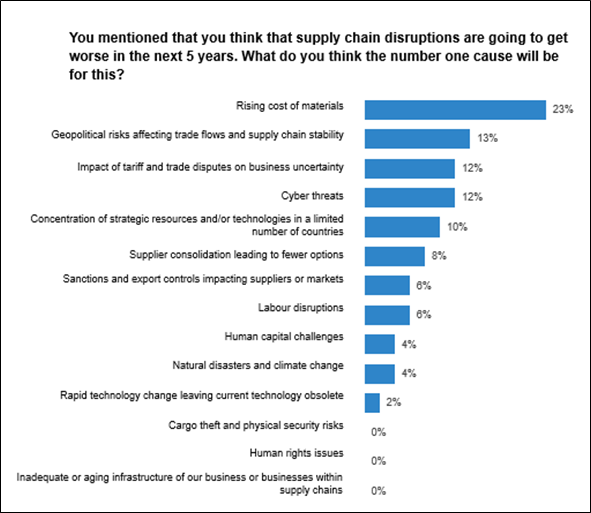Around one in five respondents in the UK (19%) predict that supply chain disruptions will worsen in the next five years with the top cause identified as the rising cost of materials (23%). Once again, the impact of political and economic developments featured heavily, with 13% of respondents stating that geopolitical risks affecting trade flows and supply chain stability would be a top cause of further disruption, while the same proportion also identified the impact of tariff and trade disputes on business uncertainty. Further factors are outlined in the chart below.