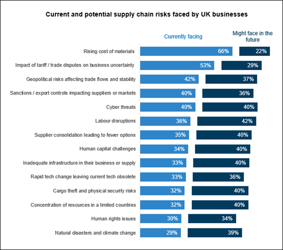 Over a quarter (29%) of respondents in the UK agreed that supply chain disruptions have worsened in the past five years, with two-thirds of respondents citing the rising cost of materials as the most widely faced supply chain risk currently posed to firms operating in the UK.